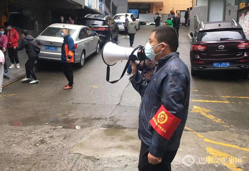 公司志愿者正在通知小區(qū)各樓層人員做核酸檢測(cè)。