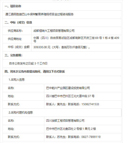 通江縣民勝鎮(zhèn)巴山牛保種繁育養(yǎng)殖場項(xiàng)目全過程咨詢服務(wù)成交公告