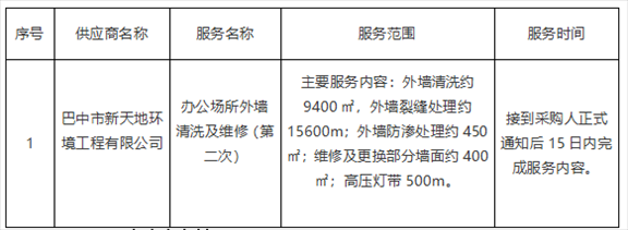 一、項(xiàng)目編號:四川文欣采商[2023]06號 二、項(xiàng)目名稱:辦公場所外墻清洗及維修(第二次)三、成交信息 供應(yīng)商名稱:巴中市新天地環(huán)境工程有限公司供應(yīng)商地址:四川省巴中市巴州區(qū)江北