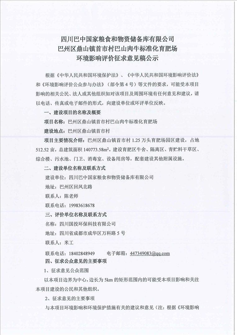 四川巴中國(guó)家糧食和物資儲(chǔ)備庫(kù)有限公司巴州區(qū)鼎山鎮(zhèn)首市村巴山肉牛標(biāo)準(zhǔn)化育肥場(chǎng)環(huán)境影響評(píng)價(jià)征求意見(jiàn)稿公示