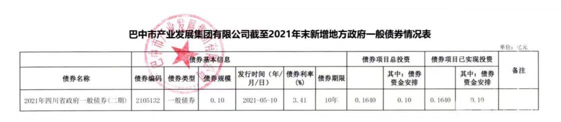 巴中市產(chǎn)業(yè)發(fā)展集團(tuán)有限公司截至2021年末地方政府債券情況公示