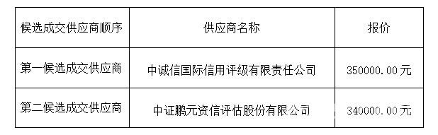 一、項(xiàng)目名稱:巴中市產(chǎn)業(yè)發(fā)展集團(tuán)有限公司2022年度主體信用評(píng)級(jí)服務(wù)項(xiàng)目二、評(píng)審結(jié)果三、成交信息成交供應(yīng)商:中誠(chéng)信國(guó)際信用評(píng)級(jí)有限責(zé)任公司成交金額:¥350000.00元(大寫:人民幣